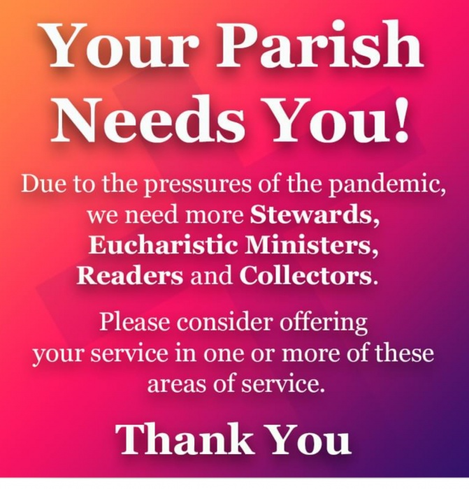 Due to the differences made by the onset of COVID 19, the parishioners and priests need those who are willing to offer their service in a number of ways. We need more Stewards, Eucharistic Ministers, Readers, Collectors.