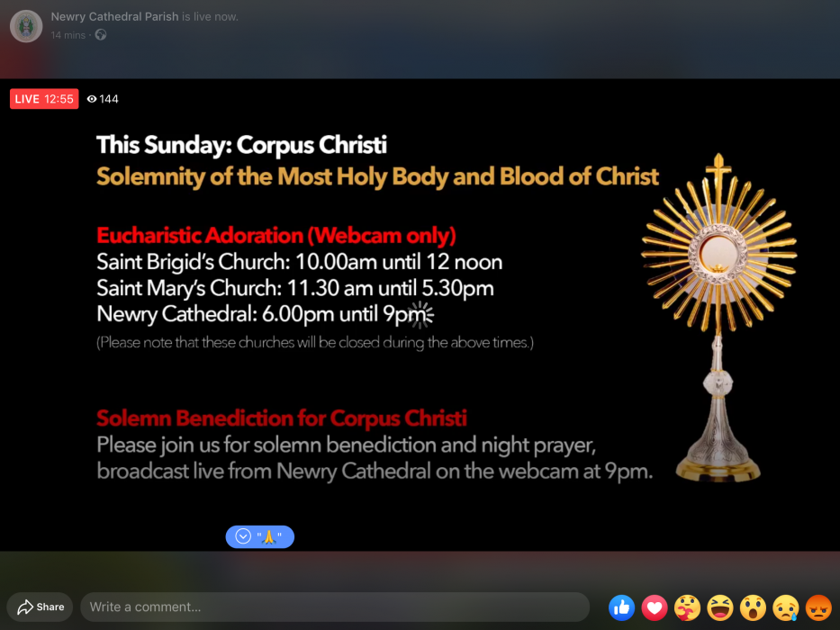 This Sunday is the Feast of Corpus Christi. To mark this day, in honour of the Body and Blood of Christ, there will be 12 hours of Eucharistic Adoration online beginning