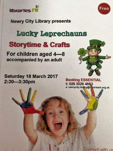 Storytime and crafts in Newry Library on Saturday 18th March 2.30 - 3.30pm. Free but booking essential.