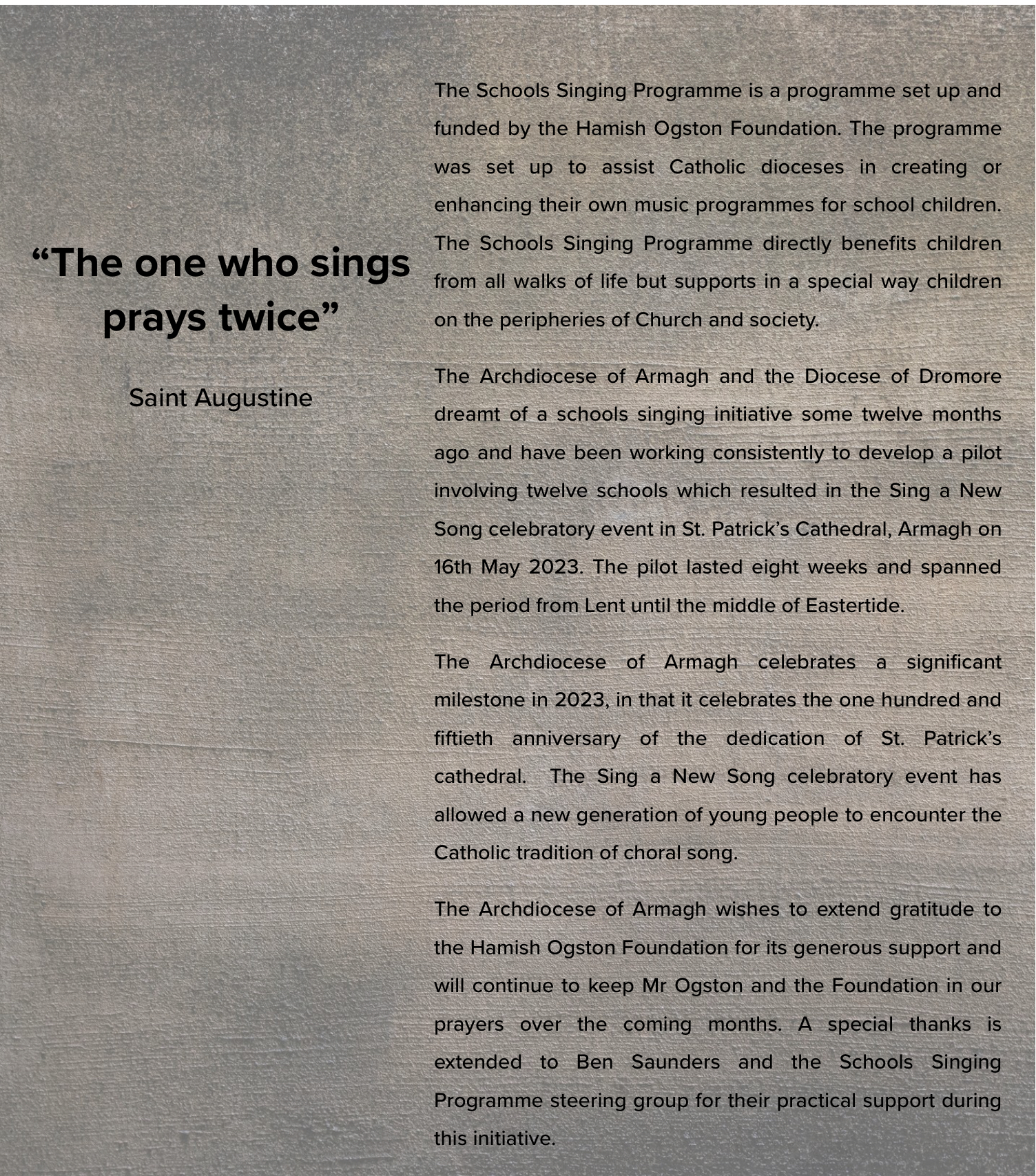 On Tuesday 16th May 2023, the Primary 5 children from St Clare's Abbey PS gathered in St Patrick's Cathedral, Armagh, along with 11 other schools from the Dromore and Armagh Dioceses, for the celebration ceremony of the Sing A New Song Project. The celebration was part of a host of celebratory events marking 150 years of St. Patrick's Cathedral, Armagh.  The event was celebrated by Archbishop Eamon Martin and led by Orla Nugent and Sarah Jane Kelly.
