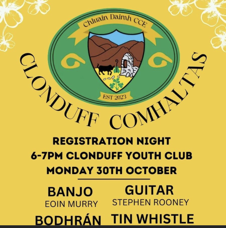 Instruments will include fiddle, tin whistle, guitar, bodhran, banjo and accordion. A registration evening will take place at Clonduff Youth Club on Monday 30th October from 6-7pm, for payment of term fees. Pupils are accepted from age 7 upwards and family concessions are available.