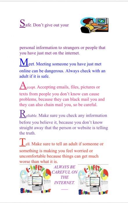 We live in a world where we can find any information we want in a few seconds on the internet. We can talk to people from all over the world, play games with other people and keep in touch with family and friends. We can use our computers, laptops, tablets, mobile phones and games consoles. But you should always be very careful about who you speak to and what information you share with other people. We want you to be safe, and that means we all need to think carefully about what we do when we are using technology.