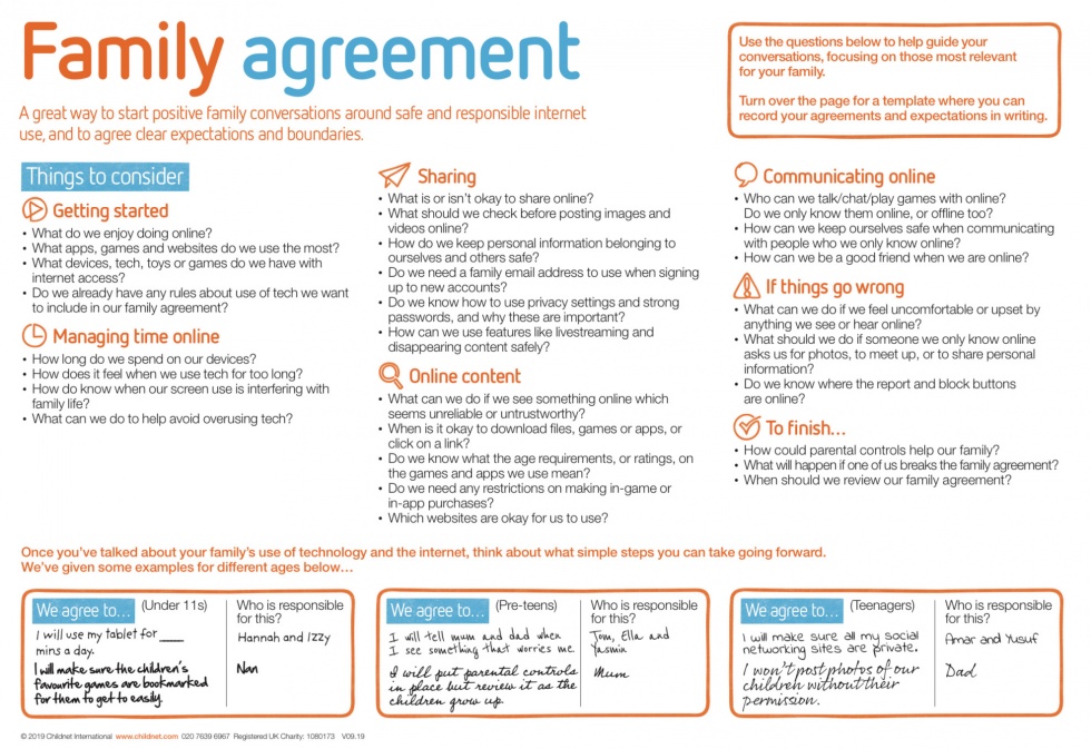So as families start spending more time at home and online it may a good idea to have a family agreement, start a conversation with your whole family about how you all use the Internet and to discuss how to behave positively online.