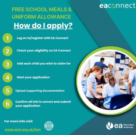 Free School Meals and Uniform Allowance applications remain open on the portal EA Connect.