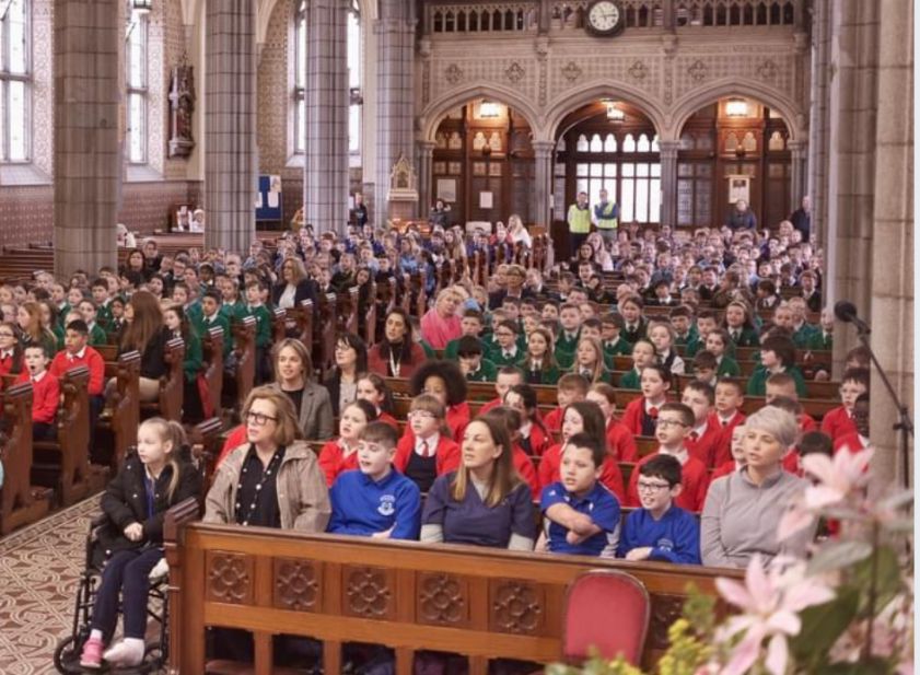 Pupils from St. Clare's Abbey, St. Colman's Saval, St. Joseph's Bessbrook, St. Joseph's Convent, St. Malachy's Camlough, St. Malachy's Carnagat, St. Patrick's The Meadow, and St. Ronan's filled the Cathedral of Saints Patrick and Colman with their wonderful voices and physical presence during a beautiful liturgy led by Archbishop Eamon Martin. Archbishop Martin, who is a passionate musician and strong singer, is keen to further endorse this inclusive singing programme which is delivered by Orla Nugent and Sara-Jane Kelly.