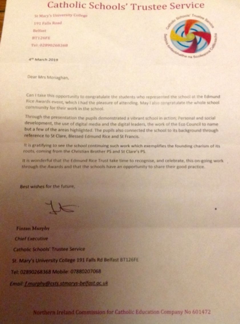 Twelve P7 boys and girls from St Clare’s Abbey travelled to Dromantine to celebrate their participation in the Edmund Rice Awards Project. This project was established in 1994 to encourage young people to respond to the needs of their local community in the spirit of Edmund Rice.