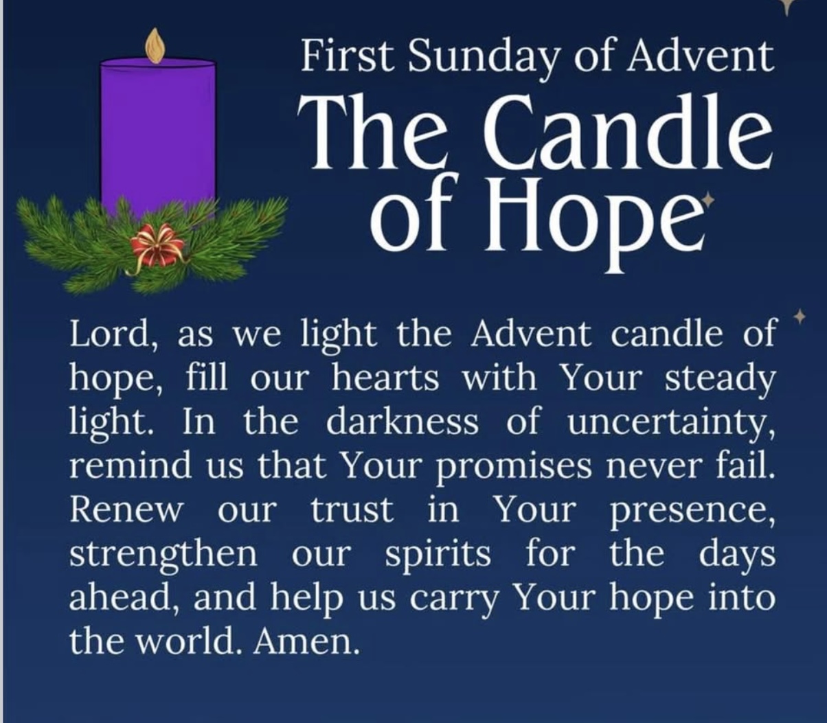 As we light the first Advent candle, May our hearts be open to receive Christ’s peace and love.