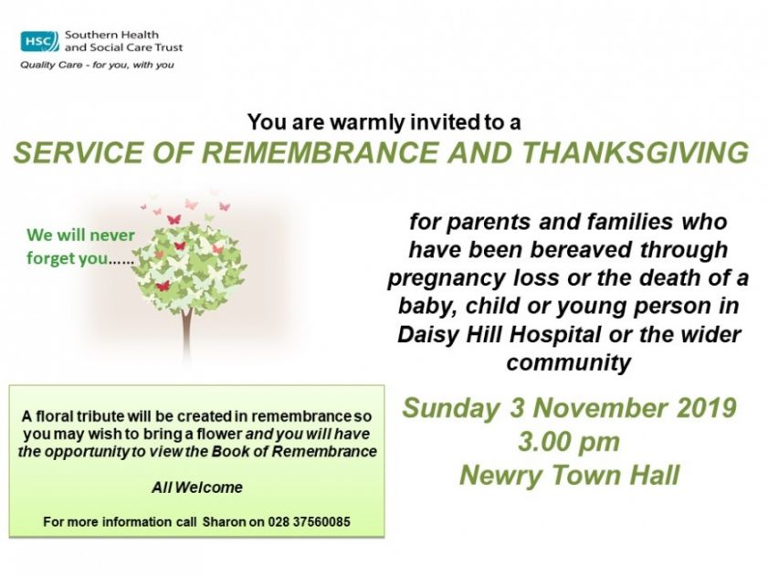 A SERVICE OF REMEMBRANCE for parents and families who have been bereaved through pregnancy loss or the death of a baby, child or young person in Daisy Hill Hospital or the wider community, will take place in Newry Town Hall on