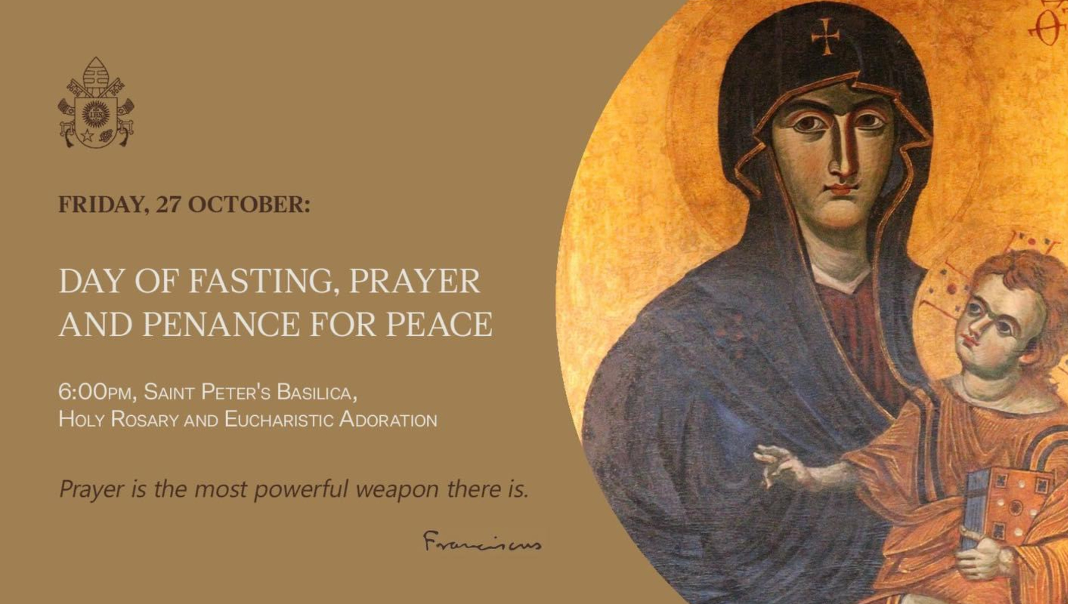 A message from Archbishop Eamon Martin inviting us to join with Pope Francis this Friday, 27 October, in a day of fasting, prayer and penance for peace in the Holy Land and the world.