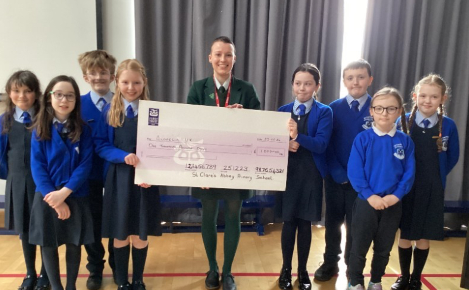 Today at our senior Assembly our school council made a representation to Sophie Keane from Sacred Heart. Sophie had spoken to our children in Term 1 about Alopecia-a condition that Sophie lives with.