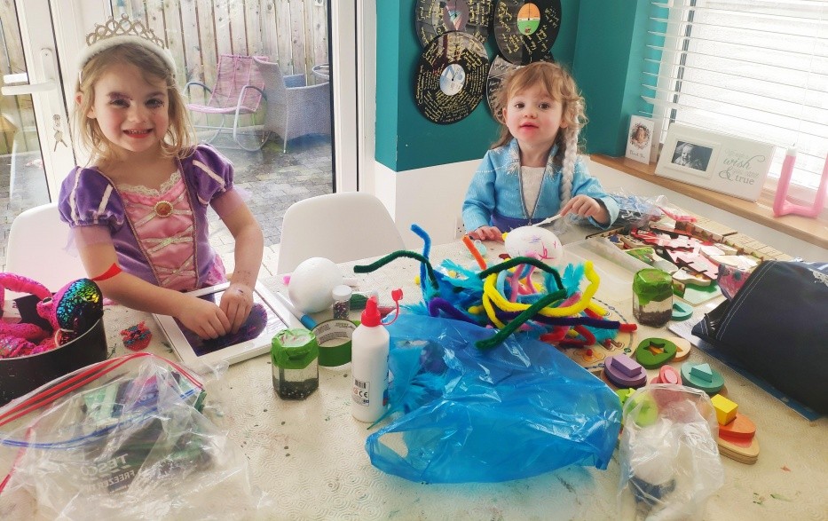 I am spending my time at home crafting, dressing up (especially in Nanny's new Disney-inspired apron creations), practising handwriting, putting on shows, DJing, baking and creating memories with my little sister.