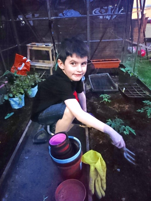 We have put tomatoe plants in the greenhouse and I will help look after them.